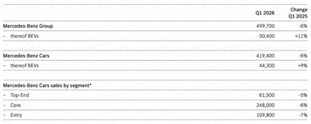 4月9日,梅賽德斯-奔馳集團在官網(wǎng)發(fā)布2026年第一季度銷量報告。數(shù)據(jù)顯示,該集團第一季度全球銷量為49.97萬輛,同比下滑6%。其中,梅賽德斯-奔馳乘用車業(yè)務(wù)全球銷量為41.94萬輛,同比下降6%,符合該公司預(yù)期。