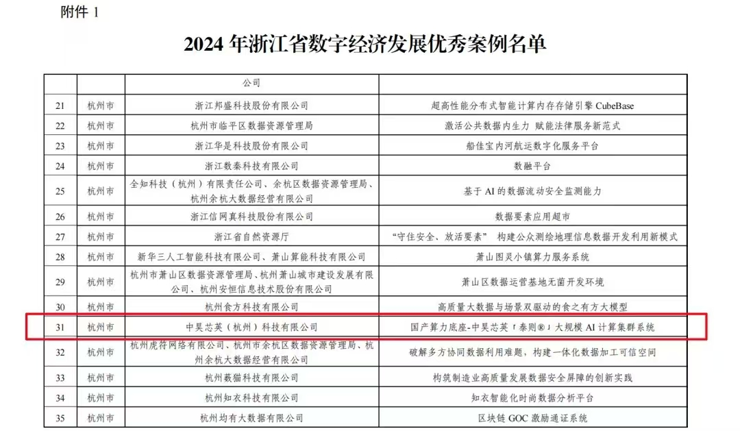 中昊芯英入選2024年浙江省數(shù)字經(jīng)濟(jì)發(fā)展優(yōu)秀案例名單