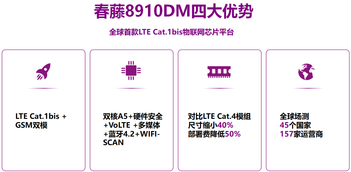 隨著5G網(wǎng)絡規(guī)模建設、2G3G網(wǎng)絡啟動清頻退網(wǎng)進程、以及政策層面正式明確物聯(lián)網(wǎng)業(yè)務向NB-IoT/4G(含Cat.1)/5G網(wǎng)絡遷移等一系列行業(yè)趨勢,Cat.1將作為中速率場景的主力軍,迎來大規(guī)模增長。憑借深厚的行業(yè)積累,紫光展銳很早看到了物聯(lián)網(wǎng)的發(fā)展趨勢,在Cat.1領域實現(xiàn)業(yè)界領先的布局和投入,推出了全球首款Cat.1bis 物聯(lián)網(wǎng)芯片平臺-春藤8910DM,可廣泛應用于共享經濟、金融支付、公網(wǎng)對講、能源、工業(yè)控制等多個領域。目前已有數(shù)十款搭載春藤8910DM芯片的Cat.1bis模組等產品上市,并已在多領域、多場景落地應用。