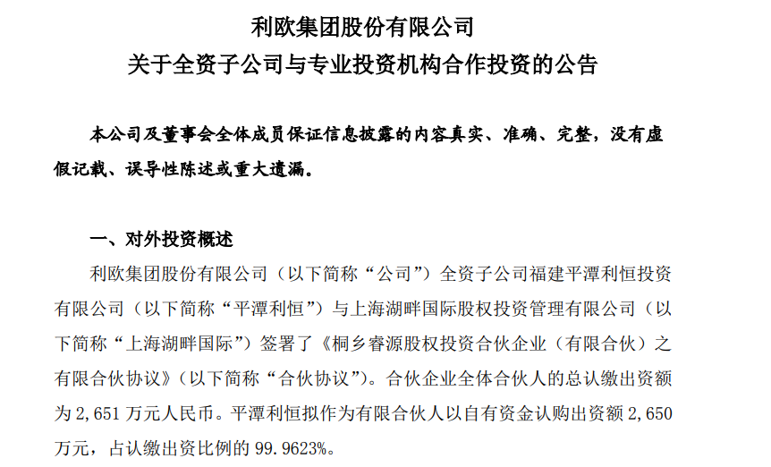 SemiW半導體世界2021年11月10日消息,據利歐集團股份有限公司(以下簡稱“利歐股份”)晚間公告,公司全資子公司福建平潭利恒投資有限公司與上海湖畔國際股權投資管理有限公司簽署了《桐鄉(xiāng)睿源股權投資合伙企業(yè)(有限合伙)之有限合伙協(xié)議》。合伙企業(yè)全體合伙人的總認繳出資額為2651萬元人民幣。平潭利恒擬作為有限合伙人以自有資金認購出資額2650萬元,占認繳出資比例的99.9623%。