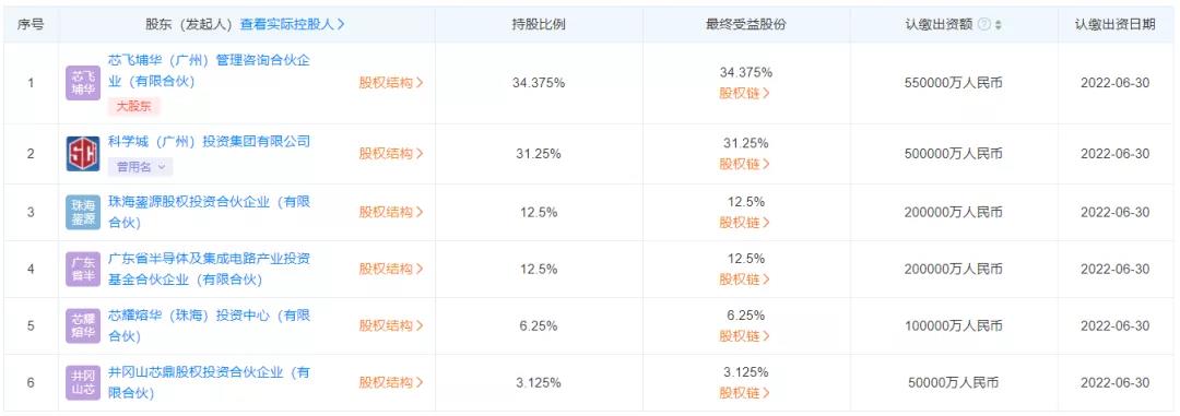 值得一提的是,灣區(qū)半導(dǎo)體產(chǎn)業(yè)集團在今年10月29日正式注冊成立,注冊資本高達160億元,其中芯飛埔華認(rèn)繳出資55億元,持股34.375%;科學(xué)城認(rèn)繳出資50億元,持股31.25%,珠海鋆源和廣東省半導(dǎo)體及集成電路產(chǎn)業(yè)基金各認(rèn)繳出資20億元,分別持股12.5%,芯耀熔華認(rèn)繳出資10億元,持股6.25%,井岡山芯鼎認(rèn)繳出資5億元,持股3.125%。