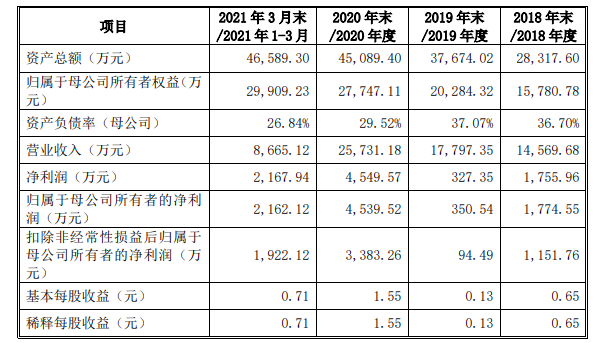 根據(jù)招股書,安芯電子2018年-2021年1-3月的營(yíng)業(yè)收入分別為1.46億元、1.78億元、2.57億元、8665.12萬(wàn)元;歸母凈利潤(rùn)分別為1774.55萬(wàn)元、350.54萬(wàn)元、4539.52萬(wàn)元、2162.12萬(wàn)元;研發(fā)投入占營(yíng)業(yè)收入的比例分別為7.43%、7.81%、6.58%、6.54%。