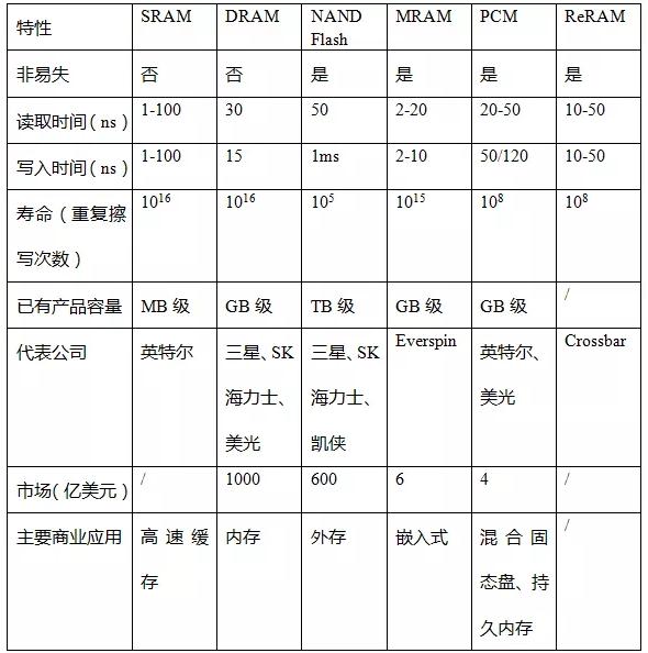 表 新型存儲及傳統(tǒng)存儲特性對比