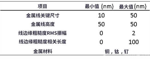 在晶圓廠里,通過改變線關(guān)鍵尺寸和金屬來進(jìn)行線邊緣粗糙度變化實(shí)驗(yàn)很困難,也需要花費(fèi)很多時(shí)間和金錢。由于光刻和刻蝕工藝的變化和限制,在硅晶圓上控制線邊緣粗糙度也很困難。因此,虛擬制造也許是一個(gè)更直接和有效的方法,因?yàn)樗梢?ldquo;虛擬地”生成具有特定線邊緣粗糙度的金屬線結(jié)構(gòu),進(jìn)而計(jì)算出相應(yīng)顯粗糙度條件下金屬的電阻率。圖2(a)顯示了使用虛擬半導(dǎo)體建模平臺(tái) (SEMulator3D®) 模擬金屬線邊緣粗糙度的版圖設(shè)計(jì)。圖2(b)和2(c)顯示了最終的虛擬制造結(jié)構(gòu)及其模擬線邊緣粗糙度的俯視圖和橫截面圖。通過設(shè)置具體的粗糙度振幅(RMS)和相關(guān)長度(噪聲頻率)值,可以在虛擬制造的光刻步驟中直接修改線邊緣粗糙度。圖2(d)顯示了不同線邊緣粗糙度條件的簡單實(shí)驗(yàn)。圖中不同RMS振幅和相關(guān)長度設(shè)置條件下,金屬的線邊緣展示出了不同的粗糙度。這些數(shù)據(jù)由SEMulator3D的虛擬實(shí)驗(yàn)仿真生成。為了系統(tǒng)地研究不同的關(guān)鍵尺寸和材料及線邊緣粗糙度對金屬線電阻的影響,使用了表1所示的實(shí)驗(yàn)條件進(jìn)行結(jié)構(gòu)建模,然后從相應(yīng)結(jié)構(gòu)中提取相應(yīng)條件下的金屬線電阻。需要說明的是,為了使實(shí)驗(yàn)更為簡單,模擬這些結(jié)構(gòu)時(shí)沒有將內(nèi)襯材料納入考慮。