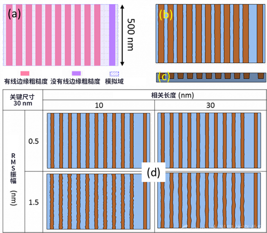 圖2:(a) 版圖設(shè)計(jì);(b) 生成的典型金屬線俯視圖;(c) 金屬線的橫截面圖;(d) 不同RMS和相關(guān)長度下的線邊緣粗糙度狀態(tài)