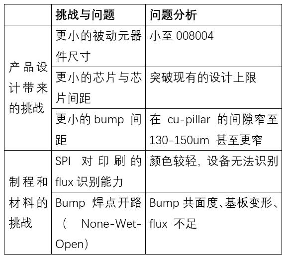 因?yàn)楫a(chǎn)品設(shè)計(jì)要求在更小的封裝尺寸上實(shí)現(xiàn)復(fù)雜的更強(qiáng)大模組功能,那么必須要在模組內(nèi)部進(jìn)行高密度的貼裝。但這給SMT工藝帶來了前所未有的的挑戰(zhàn),如表1所示。