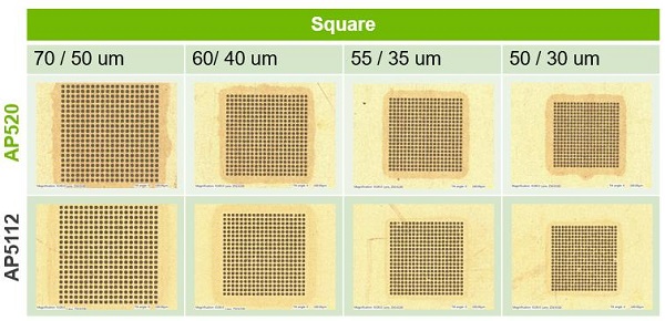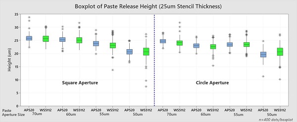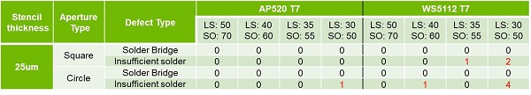 從表3可以看出,AP520 T7具有更大的工藝窗口,能夠支持的最小孔徑尺寸(SO)達(dá)55um,而WS5112 T7從60um孔徑及以下開始出現(xiàn)錫膏量不足的問題。