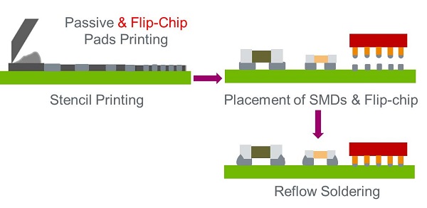 如圖1所示工藝流程,首先使用第一臺(tái)印刷機(jī)印刷助焊劑在倒裝芯片的位置上,然后再使用第二臺(tái)印刷機(jī)印刷錫膏在無源器件的位置上,但是,需要使用階梯鋼網(wǎng)將已印刷助焊劑的位置規(guī)避掉,以防止第二次印刷對(duì)助焊劑的影響。所以這樣的制程中需要兩臺(tái)印刷機(jī)、兩張鋼網(wǎng)、兩種材料(助焊劑和錫膏)。