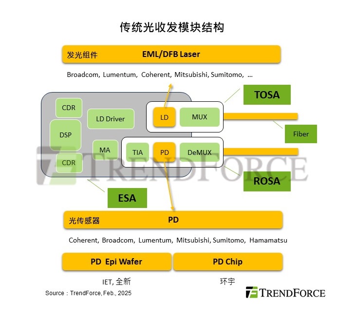在光傳感器的供應(yīng)鏈當(dāng)中,目前主要的供應(yīng)商多半集中在既有激光光源的美日等大廠手中,如Broadcom、Coherent、Lumentum、Hamamatsu等公司。然而隨著光模塊的傳輸速度增加至200Gbps左右,光傳感器挑戰(zhàn)也越來(lái)越高。由于光傳感器的優(yōu)劣取決于收光的靈敏度。因此外延的材料摻雜均勻度或結(jié)構(gòu)缺陷都會(huì)影響收光效果。200Gbps Per Lane的PD(光電二極管)光傳感器目前除了Broadcom完全自制之外,Coherent的100Gbps與Lumentum、Hamamatsu等大廠的200Gbps PD的外延則交由美商IET代工。
