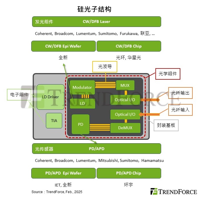 至于硅光子模塊當(dāng)中的CW激光(連續(xù)波激光),由于激光的光調(diào)變與分波等功能被硅光子(SiPh)制程整合了,因此僅需要提供光源,部分廠商因而進(jìn)入CW 激光的代工供應(yīng)鏈當(dāng)中。如聯(lián)亞透過幫國(guó)際數(shù)據(jù)中心大廠制作CW 激光、華星光與光環(huán)等廠商則結(jié)合了激光芯片制程進(jìn)行代工。