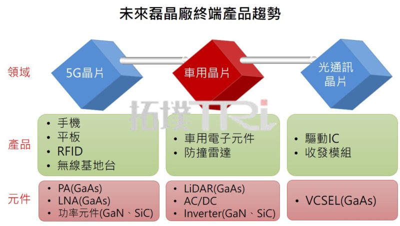 化合物半導(dǎo)體材料的高電子遷移率、直接能隙與寬能帶等特性,恰好符合未來半導(dǎo)體發(fā)展所需,終端產(chǎn)品趨勢將由 5G 通訊、車用電子與光通訊領(lǐng)域等應(yīng)用主導(dǎo)。