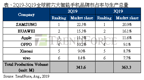 根據(jù)全球市場研究機構集邦咨詢調查,第二季智能手機需求走出淡季陰霾,生產總數(shù)來到3.44億支,較上一季成長10.5%。然而受國際市場上諸多不確定性因素的干擾,第二季智能手機生產總量與去年同期相比衰退2.4%,前六名依序為三星、華為、蘋果、OPPO、小米以及vivo。