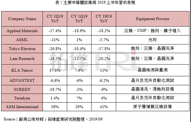 從各主要設備商第二季公布的財報分析,受到2019年半導體產業(yè)狀況衰退影響,以晶圓廠擴廠的設備采買為主要營收之半導體設備廠商,2019上半年營收對比2018年同期多數呈現衰退,包括Applied Materials、Tokyo Electronics、ASML、Lam Research、ADVANTEST、SCREEN、Hitachi-High-Technology等。