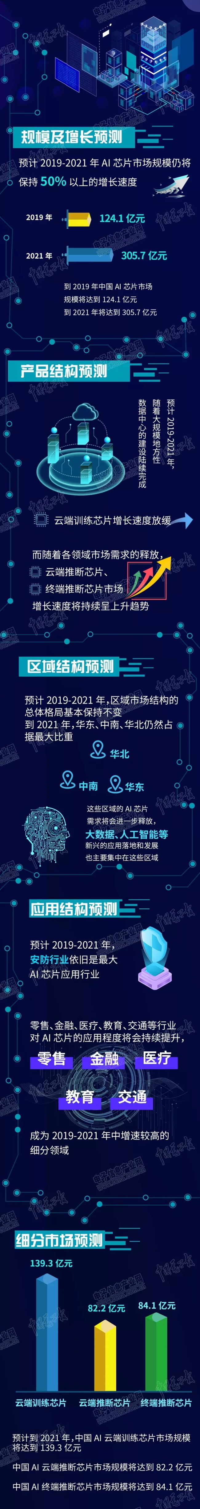 2019-2021年,中國AI芯片市場規(guī)模仍將保持50%以上的增長速度,到2021年,市場規(guī)模將達(dá)到305.7億元。賽迪智庫預(yù)測,2019-2021年,云端訓(xùn)練芯片增速放緩,云端推理芯片、終端推理芯片市場增長速度將持續(xù)呈上升趨勢。預(yù)計(jì)2021年,中國云端訓(xùn)練芯片市場規(guī)模將達(dá)到139.3億元,云端推理芯片市場規(guī)模將達(dá)到82.2億元,終端推理芯片達(dá)到84.1億元。