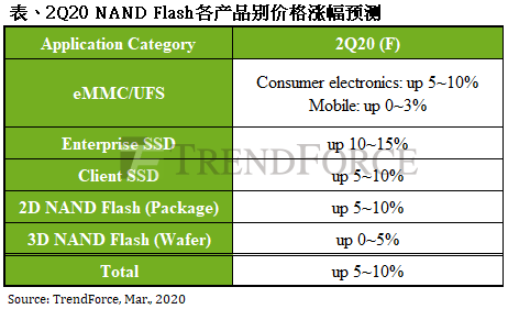 以手機(jī)品牌廠需求來看,由于NAND Flash庫存水位本就不高,加上預(yù)期后續(xù)價(jià)格將上漲以及疫情可能對供貨與物流產(chǎn)生影響,因此并未調(diào)整采購計(jì)劃。然而,全球疫情的急速擴(kuò)散已使供應(yīng)商及品牌廠開始評估下半年需求衰退的可能性,對下半年的采買需求恐有沖擊。而與中小容量eMMC較有關(guān)連的消費(fèi)性商品如電視、機(jī)上盒等,現(xiàn)階段雖仍維持訂單,但下半年可能也將面臨庫存修正的壓力。預(yù)估eMMC第二季價(jià)格仍有5%以上的漲幅,但漲勢可能難以延續(xù)至第三季。