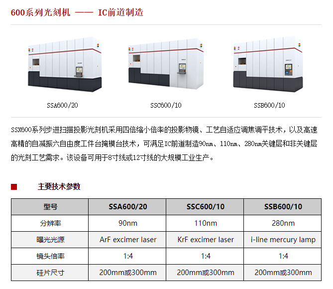 而上海微電子裝備方面,官網(wǎng)顯示其目前量產(chǎn)的光刻機(jī)包括200系列光刻機(jī)(TFT曝光)、300系列光刻機(jī)(LED、MEMS、Power Devices制造)、500系列光刻機(jī)(IC后道先進(jìn)封裝)、600系列光刻機(jī)(IC前道制造)。其中,用于IC前道制造用的600系列光刻機(jī)共有3款,性能最好的是SSA600/20,曝光光源ArF excimer laser、分辨率90nm。