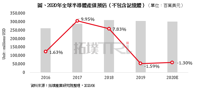 此外,目前預估第三季與第四季的需求連貫性可能不強,第三季需求放緩程度及客戶庫存水位調(diào)整狀況是重要的判斷指標,第四季節(jié)慶購物效應則需視商業(yè)活動復蘇情況而定;如此一來,旺季效應的發(fā)酵力道將有所改變,影響半導體供應鏈在 2020 下半年整體生產(chǎn)進度與庫存調(diào)整狀況,進而導致下半年營收成長幅度可能不如上半年,因此對 2020 年不包含存儲器的全球半導體產(chǎn)值預估仍維持小幅衰退的看法。