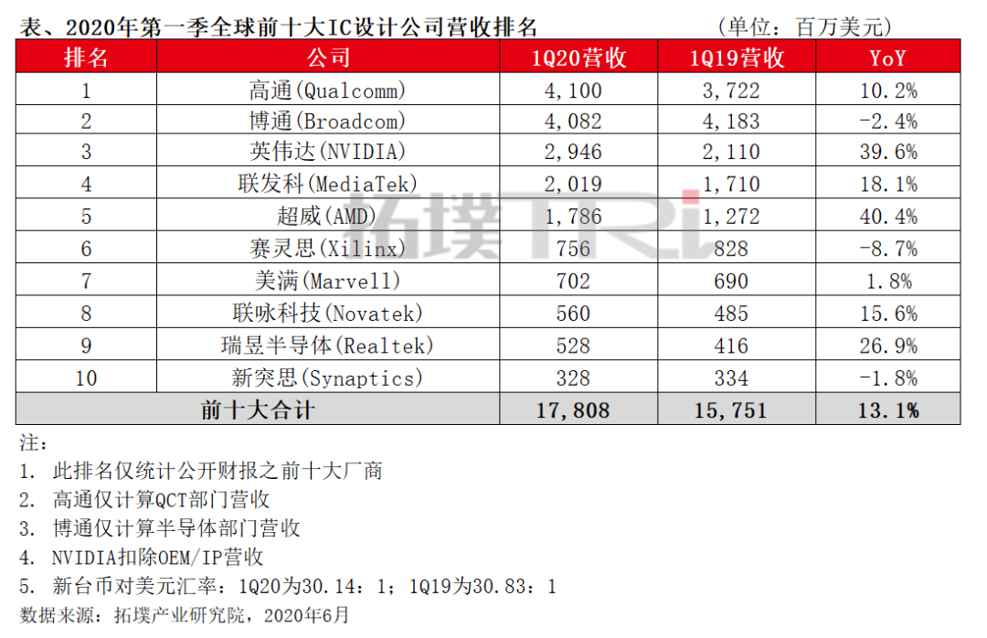 根據(jù)集邦咨詢旗下拓墣產(chǎn)業(yè)研究院最新統(tǒng)計,全球前十大IC設(shè)計業(yè)者2020年第一季營收及排名出爐,高通(Qualcomm)受惠于5G產(chǎn)品策略奏效,以及疫情催生的遠(yuǎn)程辦公與教學(xué)需求大幅成長,營收擺脫連續(xù)六季年衰退的態(tài)勢;博通(Broadcom)半導(dǎo)體部門則因為市場競爭與中美貿(mào)易摩擦的影響,營收呈現(xiàn)連續(xù)五季的負(fù)成長,使得一、二名排名易位。