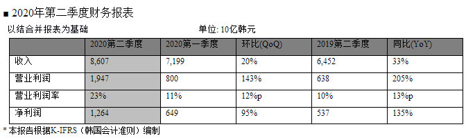 盡管新型冠狀病毒肺炎帶來的不確定性持續(xù),但由于服務(wù)器存儲器需求的強勢,形成了有利的價格環(huán)境,并且旗艦產(chǎn)品的良率提高導(dǎo)致成本降低, 第二季度的收入和營業(yè)利潤比上一季度分別增長了20%和143%。