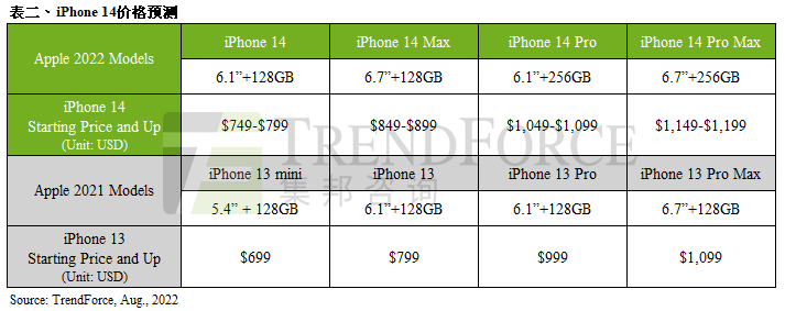 第二季為蘋果(Apple)新舊機種交接的過渡期,且多為年度生產表現(xiàn)最低的一個季度。第二季因上海、昆山等地受疫情影響,在供應鏈補給受到沖擊的狀況下,初期稼動表現(xiàn)受到影響。隨著疫情平緩后通過產能調整,已補足之前產生的產出缺口,第二季仍有4,820萬支的產出,位居全球第二。展望第三季,四款新機當中的iPhone 14 Pro及Pro Max處理器將升級至A16(TSMC 4nm),存儲器起始容量提升至LPDDR5 6GB以及256GB,主鏡頭像素增加為4,800萬,加上Face ID外觀設計變更等,預估起始定價也將隨之上揚。不過在全球高通脹以及匯差的壓力下,蘋果可望采取更謹慎的定價格策略以免影響銷售表現(xiàn),預估價格上漲幅度應有機會落在100美元以內。