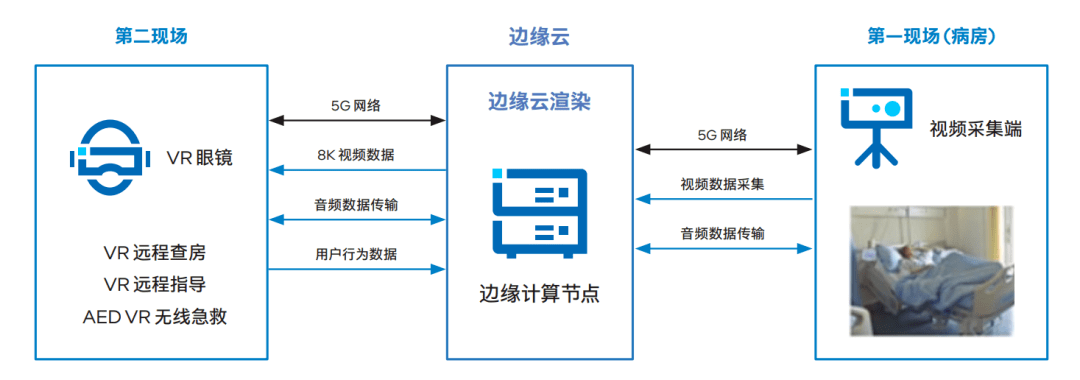首先,遠程實時查房等VR應用帶來海量的數據采集、處理和傳輸需求,如全部工作負載均通過遠端數據中心/云服務完成,勢必帶來巨大網絡壓力。而VR應用中的沉浸式、交互式體驗,也需要方案能有效縮短系統的端到端整體時延;