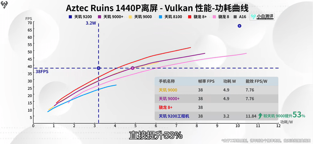與此同時(shí),天璣9200的GPU能效比同樣實(shí)現(xiàn)了大幅提升,在Aztec Ruins 1440P離屏Vulkan測(cè)試中,天璣9200的能效比相比上一代大幅提升了53%??梢哉f天璣9200無論是GPU性能、功耗還是能效比的表現(xiàn)都是業(yè)界領(lǐng)先,聯(lián)發(fā)科在GPU方面的確下了狠勁兒。