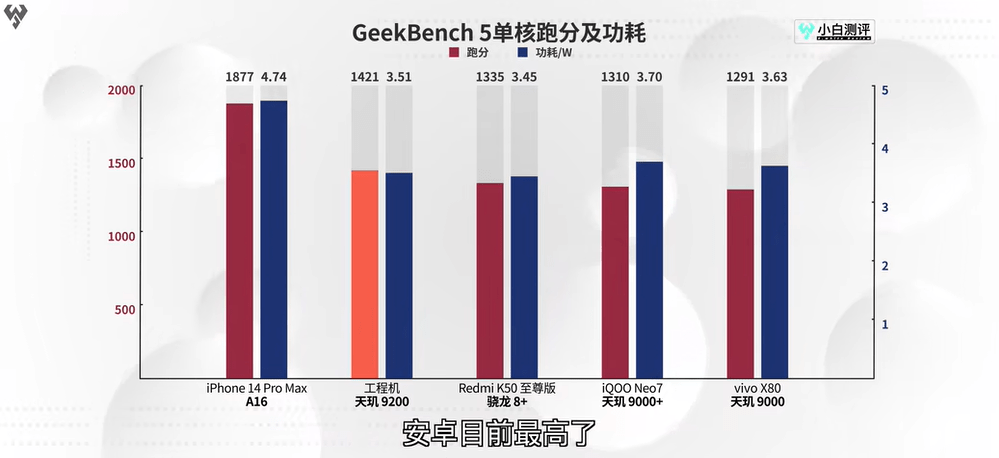 在天璣9200發(fā)布后不久,多家媒體發(fā)布了這顆旗艦芯的工程機(jī)評(píng)測(cè)。知名數(shù)碼大V小白測(cè)評(píng)最新發(fā)布的數(shù)據(jù)顯示,CPU方面,天璣9200工程機(jī)的GeekBench 5跑分單核高達(dá)1421分,為目前安卓芯片陣營(yíng)最高。