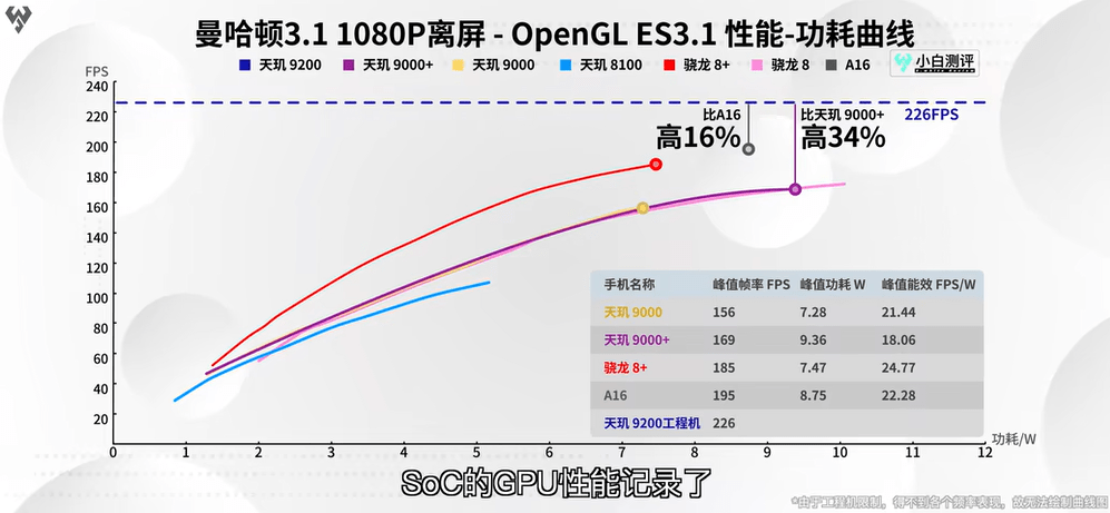 GPU方面,在GFXBench的曼哈頓3.1 OpenGL 1080P和Aztec Ruins Vulkan 1440P兩項(xiàng)離屏測(cè)試中,天璣9200均展現(xiàn)出了傲人的成績(jī)。其中曼哈頓3.1測(cè)試中,天璣9200的11核G715跑出了226fps的高分,性能相較于天璣9000+的169fps提升了34%,且是其中表現(xiàn)極佳的,刷新了小白測(cè)評(píng)數(shù)據(jù)庫(kù)手機(jī)SoC的GPU性能記錄。