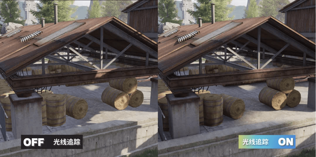 在《暗區(qū)突圍》游戲中的實(shí)際應(yīng)用上,在游戲環(huán)境的陰影效果方面, 室外的光線追蹤陰影能夠模擬真實(shí)的太陽光陰影形態(tài),近處的陰影銳利,遠(yuǎn)處的陰影柔和?;诠饩€追蹤的環(huán)境光遮蔽,能夠體現(xiàn)出相交物體間的漫反射光線遮擋效果,進(jìn)而強(qiáng)調(diào)出物體間的擺放關(guān)系,讓畫面更有層次感。相較于傳統(tǒng)的環(huán)境光遮蔽技術(shù),基于光線追蹤的環(huán)境光遮蔽,由于可以獲取到準(zhǔn)確的場景信息,其能夠更加精準(zhǔn)地體現(xiàn)物體間的環(huán)境光遮蔽關(guān)系,避免傳統(tǒng)技術(shù)中的黑暈等現(xiàn)象出現(xiàn)。更好的優(yōu)化了玩家在游戲地圖中的真實(shí)體驗(yàn)感。以高度還原自然光的品質(zhì)為玩家提供更身臨其境的戰(zhàn)局感。