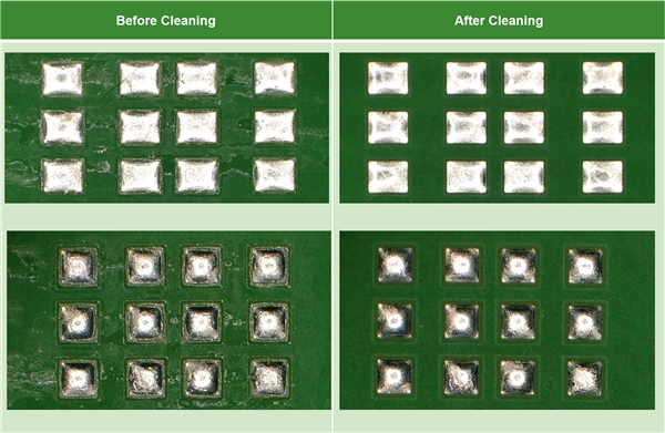 如圖7所示,僅使用DI水即可完全清洗掉助焊劑殘留,無需添加任何洗滌劑,在降低成本的同時,也可以減少了對環(huán)境的污染。