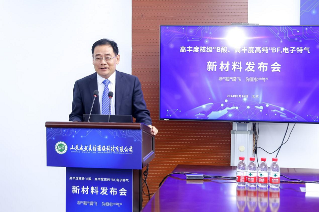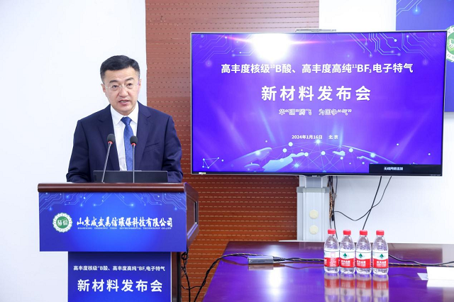 1月16日,“高豐度核級(jí)10B酸、高豐度高純11BF3電子特氣新材料發(fā)布會(huì)”在京舉行。山東成武易信環(huán)??萍加邢薰荆ㄒ韵潞?jiǎn)稱“山東易信”)發(fā)布了高豐度核級(jí)10B酸、高豐度高純11BF3電子特氣新材料項(xiàng)目的最新進(jìn)展。2023年6月該項(xiàng)目一期成功實(shí)現(xiàn)量產(chǎn),2024年公司擬進(jìn)一步加大投入擴(kuò)大產(chǎn)能,實(shí)現(xiàn)硼同位素分離百噸級(jí)產(chǎn)能。