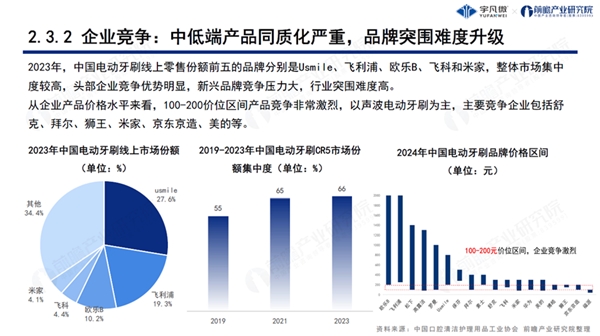 根據(jù)調(diào)研數(shù)據(jù),宇凡微與前瞻研究院洞察到中國(guó)電動(dòng)牙刷普及率仍有巨大的提升空間,預(yù)計(jì)2028年市場(chǎng)規(guī)模將超百億。居民口腔意識(shí)增強(qiáng),電動(dòng)牙刷滲透率逐年提升;功能升級(jí)推動(dòng)電動(dòng)牙刷消費(fèi)價(jià)格提升;新型渠道激發(fā)電動(dòng)牙刷潛在消費(fèi)加速釋放;國(guó)內(nèi)消費(fèi)滲透率提升空間較大,這四大核心因素為電動(dòng)牙刷市場(chǎng)規(guī)模持續(xù)增長(zhǎng)提供了有力支撐。