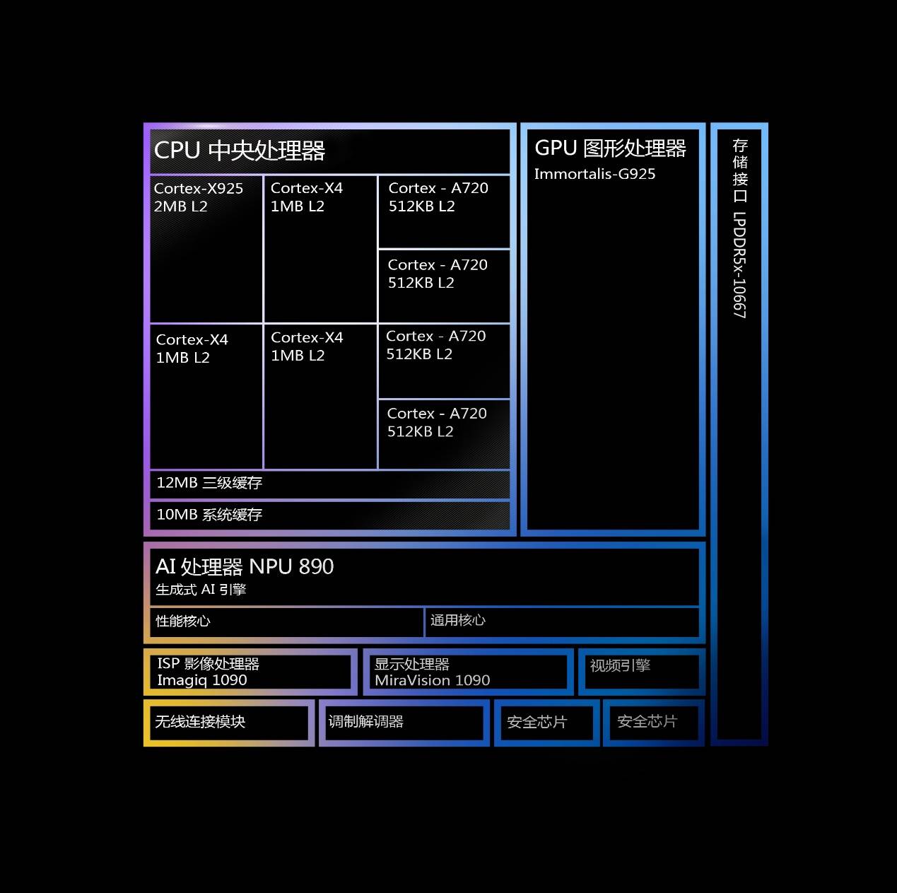 先來(lái)看看天璣9400各個(gè)方面的賬面數(shù)據(jù)最新升級(jí)。天璣9400采用了業(yè)界最先進(jìn)的第二代臺(tái)積電3nm制程,第二代全大核CPU架構(gòu)包含1個(gè)主頻高達(dá)3.62GHz 的Cortex-X925超大核,3個(gè)主頻為3.3GHz的Cortex-X4超大核和4個(gè)2.4GHz的Cortex-A720大核。而且全新的PC級(jí)Arm v9架構(gòu)讓IPC提升了15%。而且二級(jí)緩存提升100%,三級(jí)緩存也提升50%,可以完美發(fā)揮天璣9400性能潛力。這一套組合拳下來(lái),聯(lián)發(fā)科目的是要做到「既要又要」,也就是性能要更好、能耗還要更低。