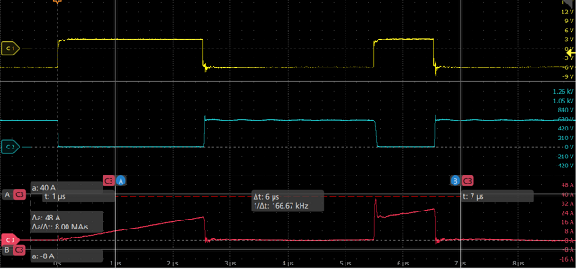 在實(shí)際測(cè)試結(jié)果中,器件的開(kāi)啟延遲Tdon為15.06ns,上升時(shí)間Tr為11.1ns,關(guān)斷延遲為13.02ns,下降時(shí)間Tf為13ns。在高壓大電流的硬開(kāi)關(guān)條件下實(shí)現(xiàn)了極高的開(kāi)關(guān)速度。