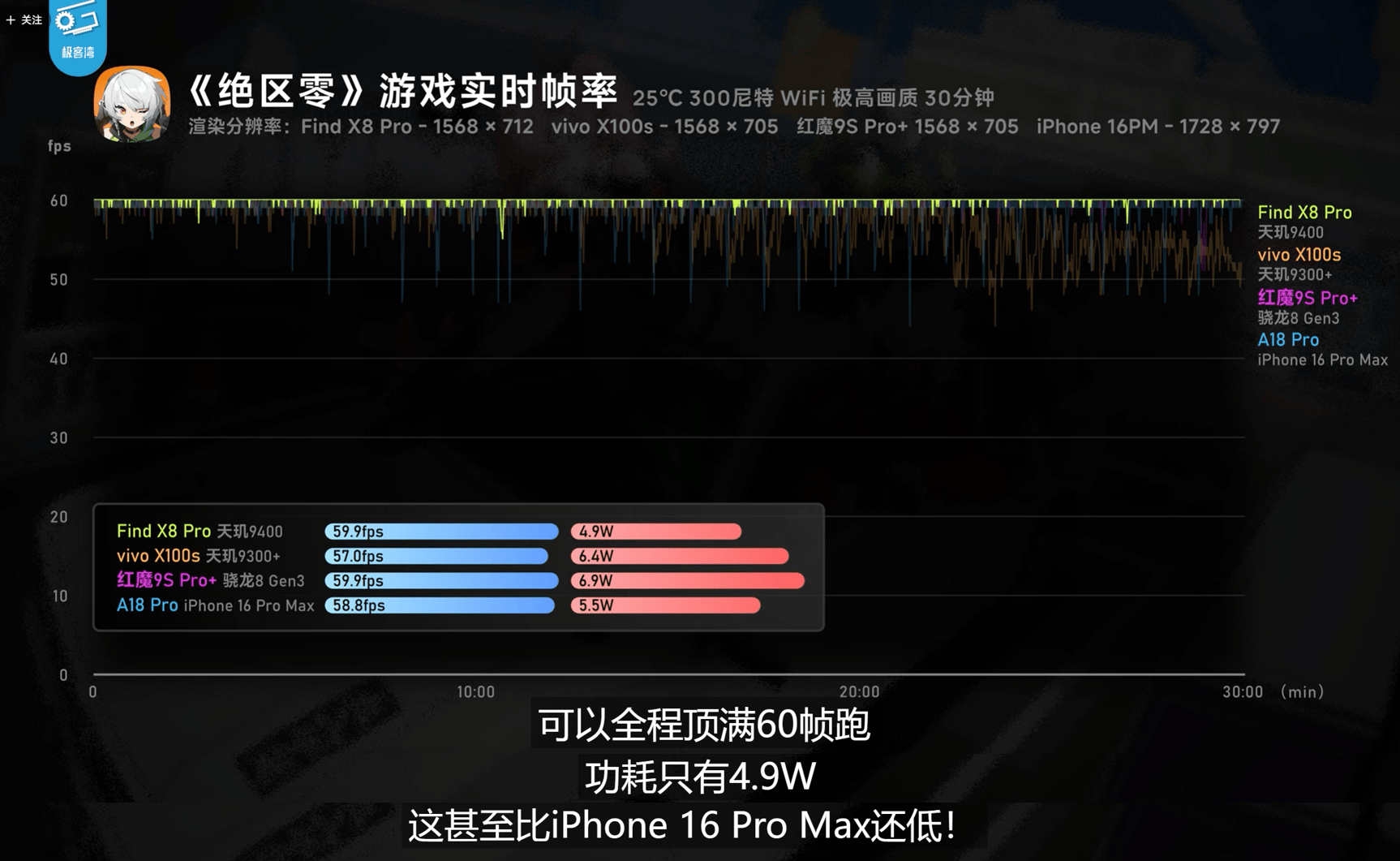 Find X8系列在媒體的游戲?qū)崪y中展現(xiàn)了超強的性能和穩(wěn)定性,即便在高亮、高溫、高幀的極限場景下,F(xiàn)ind X8 Pro依然能夠滿幀如一條直線,成為當之無愧的“滿幀戰(zhàn)神”。更值得一提的是,天璣9400不僅在性能上達到巔峰,低功耗表現(xiàn)也令人印象深刻。