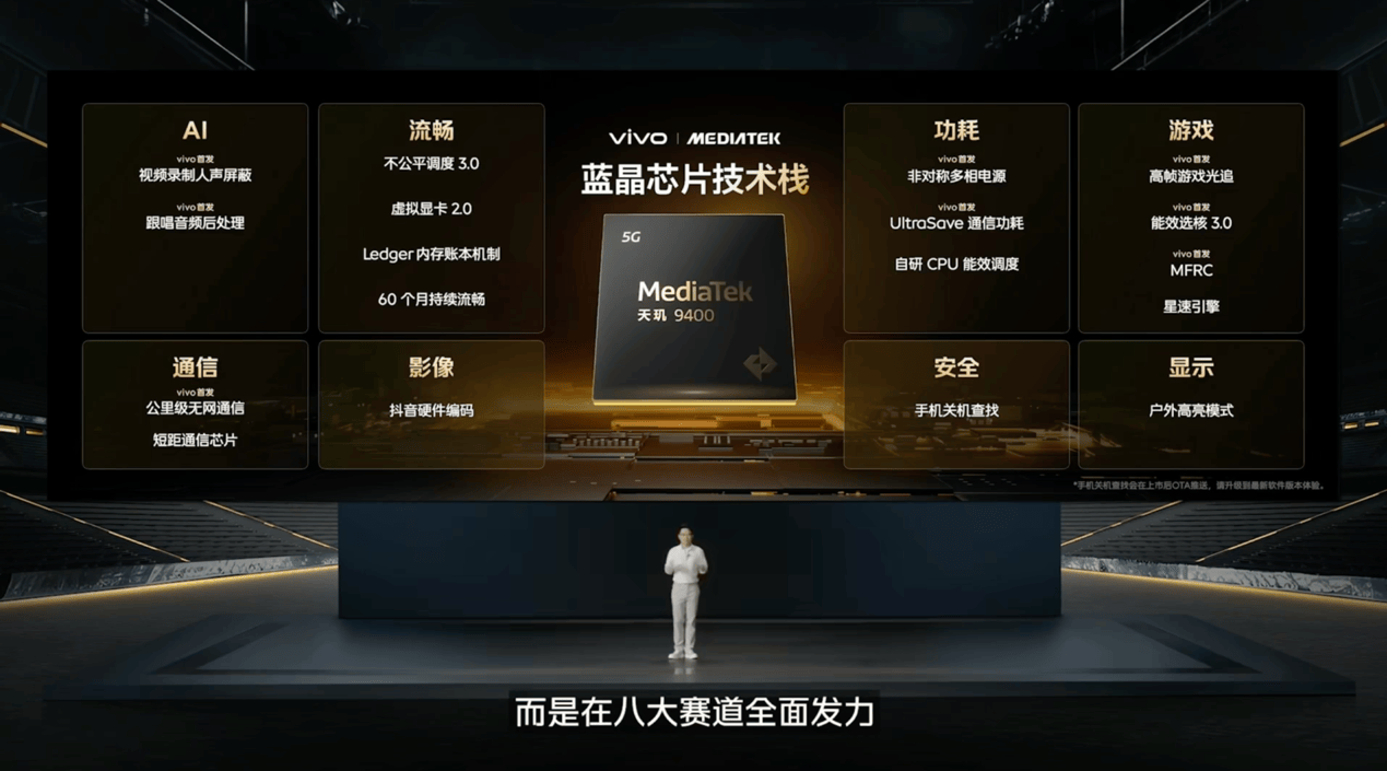 藍(lán)廠與聯(lián)發(fā)科已有多年的合作基礎(chǔ),雙方的聯(lián)合調(diào)校覆蓋性能、功耗、AI、游戲、通信等八大關(guān)鍵領(lǐng)域,這種長期的合作已經(jīng)帶來了肉眼可見的成果。比如,藍(lán)廠的天璣9400被許多KOL譽(yù)為“能效大魔王”,其在性能與能效平衡上的表現(xiàn)贏得了用戶廣泛認(rèn)可。
