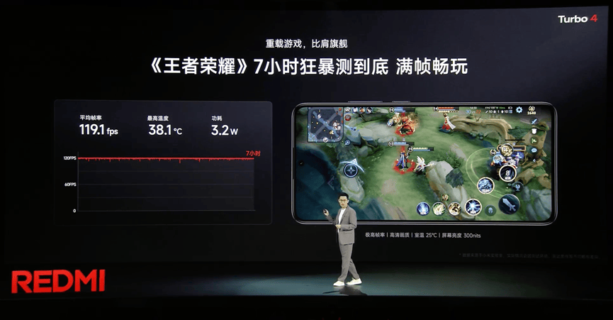 此外,為了充分釋放強大性能,REDMI與聯(lián)發(fā)科展開了深度合作,結(jié)合了HyperCore與狂暴引擎,深入平臺底層微架構(gòu),從而實現(xiàn)主流游戲的滿幀體驗,并顯著降低單幀功耗。結(jié)合Turbo 4所采用的業(yè)內(nèi)領(lǐng)先3D冰封循環(huán)泵散熱技術(shù),可以進一步發(fā)揮天璣8400-Ultra的強勁性能。在《王者榮耀》的實測中,Turbo 4能夠在極致幀率高清模式下持續(xù)運行7小時,始終保持120幀水準的穩(wěn)定表現(xiàn),且機身溫度與功耗控制表現(xiàn)優(yōu)秀。