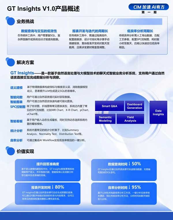用于半導(dǎo)體工廠數(shù)據(jù)分析和洞察,支持經(jīng)營(yíng)指標(biāo)智能交互與洞察?;趶?qiáng)大的語(yǔ)義建模技術(shù),將艱深的數(shù)據(jù)庫(kù)字段轉(zhuǎn)化為業(yè)務(wù)人員能看懂的業(yè)務(wù)指標(biāo)。利用自然語(yǔ)言提問(wèn)便能自解析意圖、生成SQL、執(zhí)行查詢并可視化結(jié)果,同時(shí)支持復(fù)雜Dashboard的動(dòng)態(tài)產(chǎn)生,將傳統(tǒng)需要數(shù)小時(shí)的數(shù)據(jù)提取與分析工作壓縮至分鐘級(jí)?,F(xiàn)已內(nèi)置了數(shù)十個(gè)半導(dǎo)體場(chǎng)景優(yōu)化的良率分析工作流,可一鍵追溯良率根因,減少專(zhuān)家依賴(lài),將分析任務(wù)時(shí)間縮短至分鐘級(jí)。