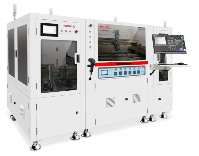 騰盛精密針對(duì)半導(dǎo)體底部填充工藝中填充不飽滿(mǎn)、空洞形成、熱管理等核心技術(shù)難點(diǎn),結(jié)合不同封裝場(chǎng)景需求,開(kāi)發(fā)了數(shù)款專(zhuān)業(yè)化底部填充設(shè)備,精準(zhǔn)適配晶圓級(jí)、面板級(jí)、板級(jí)等多類(lèi)型先進(jìn)封裝需求,銜接前端貼裝、熱處理工藝與后端檢測(cè)、點(diǎn)膠環(huán)節(jié),為半導(dǎo)體封裝可靠性提供有力支撐。例如針對(duì)板級(jí)底部填充的Sherpa900采用一體式鑄造成型工藝,搭載龍門(mén)雙驅(qū)U型直線電機(jī),點(diǎn)膠快準(zhǔn)穩(wěn)。同時(shí)其支持選配傾斜旋轉(zhuǎn)機(jī)構(gòu),實(shí)現(xiàn)芯片四邊的傾斜點(diǎn)膠,對(duì)于提升Fillet,減小KOZ效果顯著,適用于FCBGA、FCCSP、SiP等封裝中的倒裝技術(shù)。