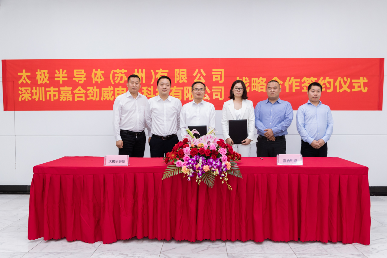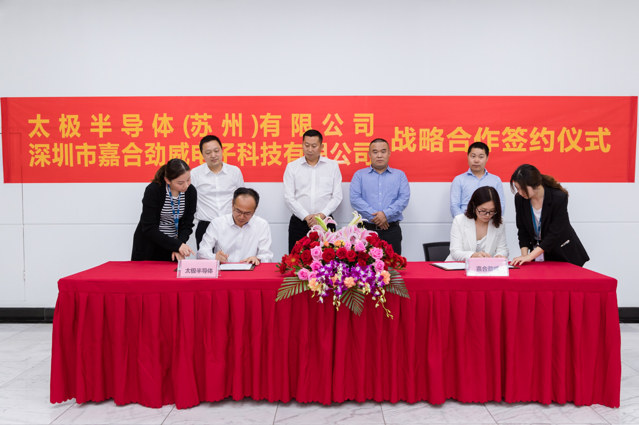 4月23日下午,太極半導(dǎo)體(蘇州)有限公司與深圳市嘉合勁威電子科技有限公司在太極半導(dǎo)體舉行了主題為“攜手共創(chuàng)、聚力共贏”的戰(zhàn)略合作簽約儀式,這標(biāo)志著雙方全面戰(zhàn)略合作伙伴關(guān)系正式確立。太極半導(dǎo)體董事、總經(jīng)理張光明、技術(shù)總監(jiān)馬軍、市場(chǎng)拓展部部長(zhǎng)王延、嘉合勁威董事長(zhǎng)張麗麗、副總經(jīng)理張喆、總監(jiān)劉坤等代表出席了簽約儀式。