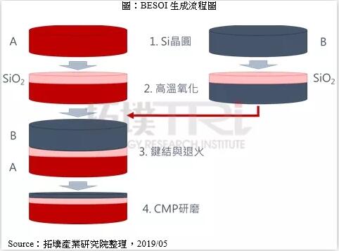 BESOI成長方式是先透過兩片Si晶圓,經(jīng)高溫氧化后形成兩片表面氧化層的結構(SiO2/Si Substrate),再將兩片氧化層相互接合并加熱(1,100℃),使其產(chǎn)生鍵結與退火,最終經(jīng)CMP研磨后形成Si/SiO2(Buried Oxide)/Si Substrate結構。盡管Si層的厚度已較SIMOX技術相對好控制,但兩片氧化層接合之鍵結良率,仍是SOI晶圓產(chǎn)能的決定關鍵,需大量時間研磨除去多余Si層。