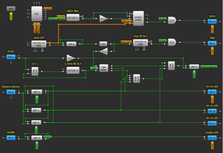 GreenPAK中的Pin3已配置為輸出,連接到HC-SRO4的TRIG引腳。CNT2和CNT3每20ms生成一個(gè)10us脈沖,發(fā)送到Pin3。