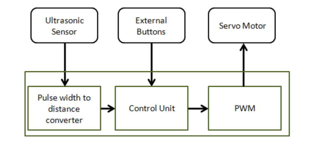 該設(shè)計(jì)包括兩個(gè)基本部分:第一部分用于接收來(lái)自超聲波傳感器的信號(hào),并將其與距離進(jìn)行關(guān)聯(lián)。 第二部分負(fù)責(zé)生成PWM信號(hào)以旋轉(zhuǎn)伺服電機(jī)。