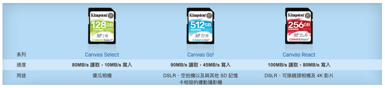 Kingston 表示,過去采用讀寫能力、容量等方式做為閃存卡產(chǎn)品的分類,新的 CANVAS 則是改以使用情境做為區(qū)分,使用一般消費(fèi)性相機(jī),單純拍照紀(jì)錄的使用者可以選擇 Canvas Select,對(duì)于有進(jìn)階攝影和拍攝影片需求的使用者則可選擇讀寫速度較高的 Canvas Go!,而 Canvas React 則是擁有最高的讀寫速度,適合需要大量拍攝影片的專業(yè)人士使用。