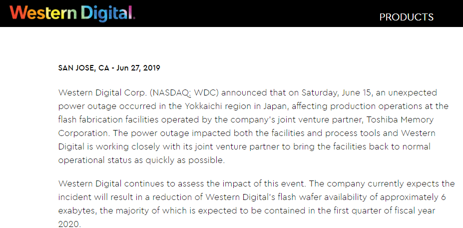 6月27日,西數(shù)發(fā)布新聞稿稱,6月15日,日本四日市地區(qū)意外停電,影響了其合資伙伴東芝閃存制造廠的生產(chǎn)運(yùn)營。西數(shù)表示,該停電事件影響了東芝設(shè)施和工藝工具,西數(shù)正在與東芝密切合作,以盡快將設(shè)施恢復(fù)到正常運(yùn)行狀態(tài)。