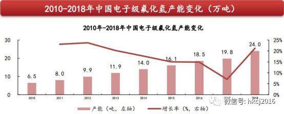氫氟酸需求增長潛力最大的領(lǐng)域是電子級(jí)氫氟酸,電子級(jí)氫氟酸主要用于去除氧化物,是半導(dǎo)體制作過程中應(yīng)用最多的電子化學(xué)品之一。電子級(jí)氫氟酸主要運(yùn)用在集成電路、太陽能光伏和液晶顯示屏等領(lǐng)域,其中第一大應(yīng)用市場(chǎng)是集成電路領(lǐng)域。根據(jù)西南證券(600369)的行業(yè)研報(bào)顯示,2018年中國電子級(jí)氫氟酸產(chǎn)能已達(dá)24萬噸。伴隨中國半導(dǎo)體行業(yè)快速增長,我國電子級(jí)氫氟酸行業(yè)進(jìn)入成熟階段。