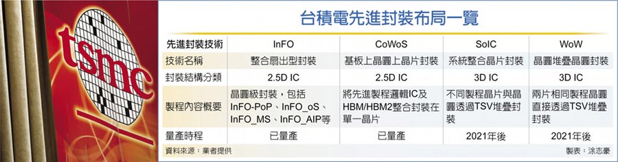 另外,看好未來5G、人工智能(AI)、高效能運算(HPC)等新應(yīng)用,芯片設(shè)計走向異質(zhì)整合及系統(tǒng)化設(shè)計,臺積電擴大先進(jìn)封裝技術(shù)研發(fā),采用硅中介層(Si Interposer)或小芯片(Chiplet)等方法,將存儲器及邏輯芯片緊密集成。同時,臺積電順利試產(chǎn)7納米系統(tǒng)整合芯片(SoIC)及16納米晶圓堆疊晶圓(WoW)等3D IC封裝制程,預(yù)期2021年之后進(jìn)入量產(chǎn)。
