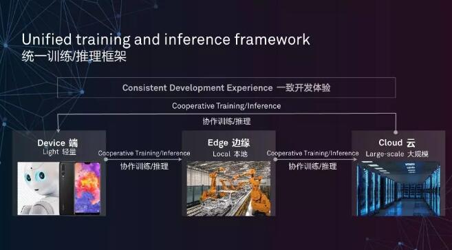 不僅開發(fā)平臺語言統(tǒng)一,訓(xùn)練和推理框架也是統(tǒng)一的,開發(fā)者可以將大量訓(xùn)練模型放在本地和云端服務(wù)器,再將輕量級的推理工作放在移動(dòng)端設(shè)備上,獲得一致的開發(fā)體驗(yàn)。