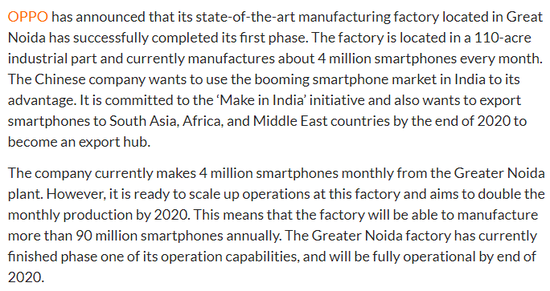 近些年,OPPO在印度做得非常好,尤其是是在中低端手機。根據(jù)最近的一份報告顯示,在2019年Q3的全球智能手機市場上OPPO占據(jù)第三位,已經(jīng)超越蘋果。除了增加大諾伊達工廠的產(chǎn)量和成為出口中心外,OPPO還將增加對位于海德拉巴研發(fā)中心的投資。該中心是中國以外最大的智能手機研發(fā)中心。