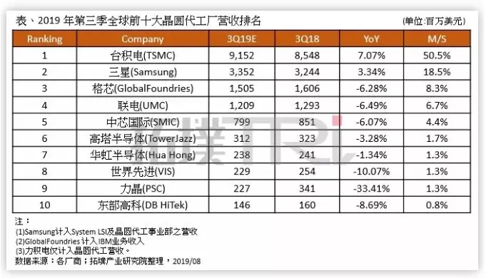 根據(jù)日前根據(jù)TrendForce旗下拓墣產(chǎn)業(yè)研究院的最新報告預(yù)估,2019年第3季的全球晶圓代工市場銷售金額將高出第2季13%,其中龍頭寶座仍由市占率過半、達到50.5%的臺積電所拿下,三星電子則以18.5%位居第2。